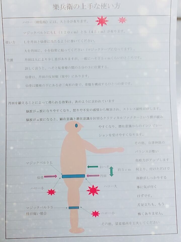 使い方は、Lを丹田と仙骨に当たるように巻いてください。大を丹田に、小を仙骨に貼ってください(マジックテープになってます)。
