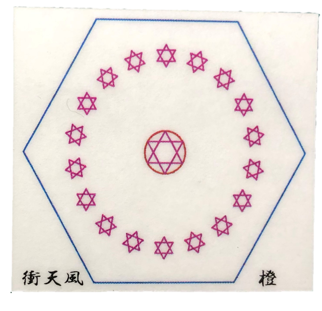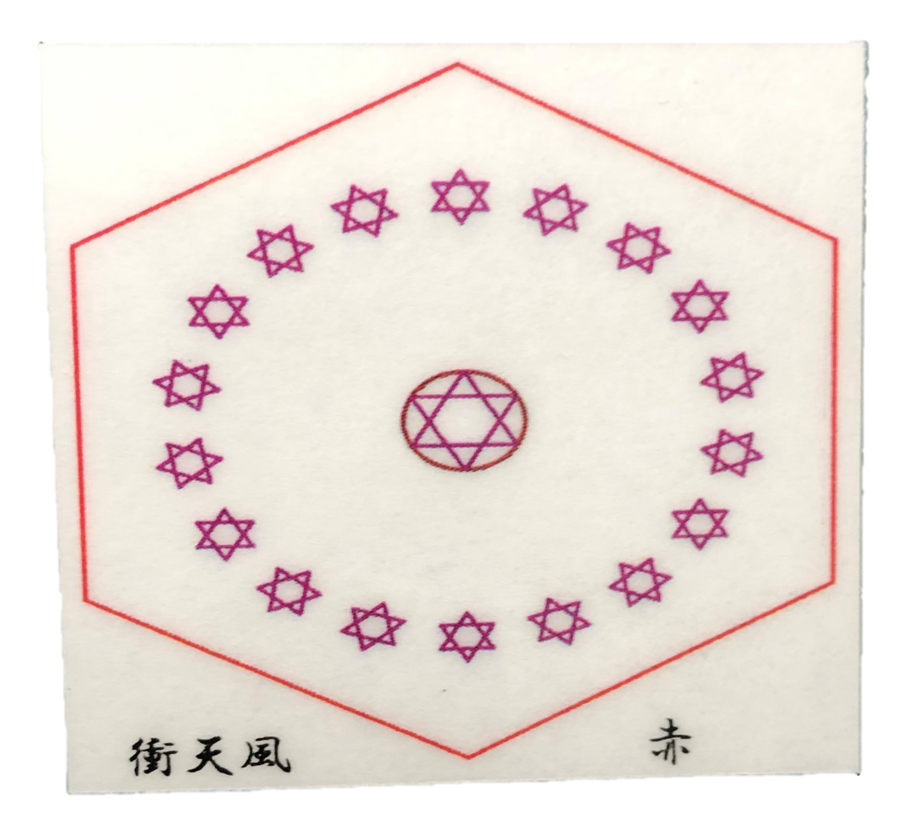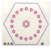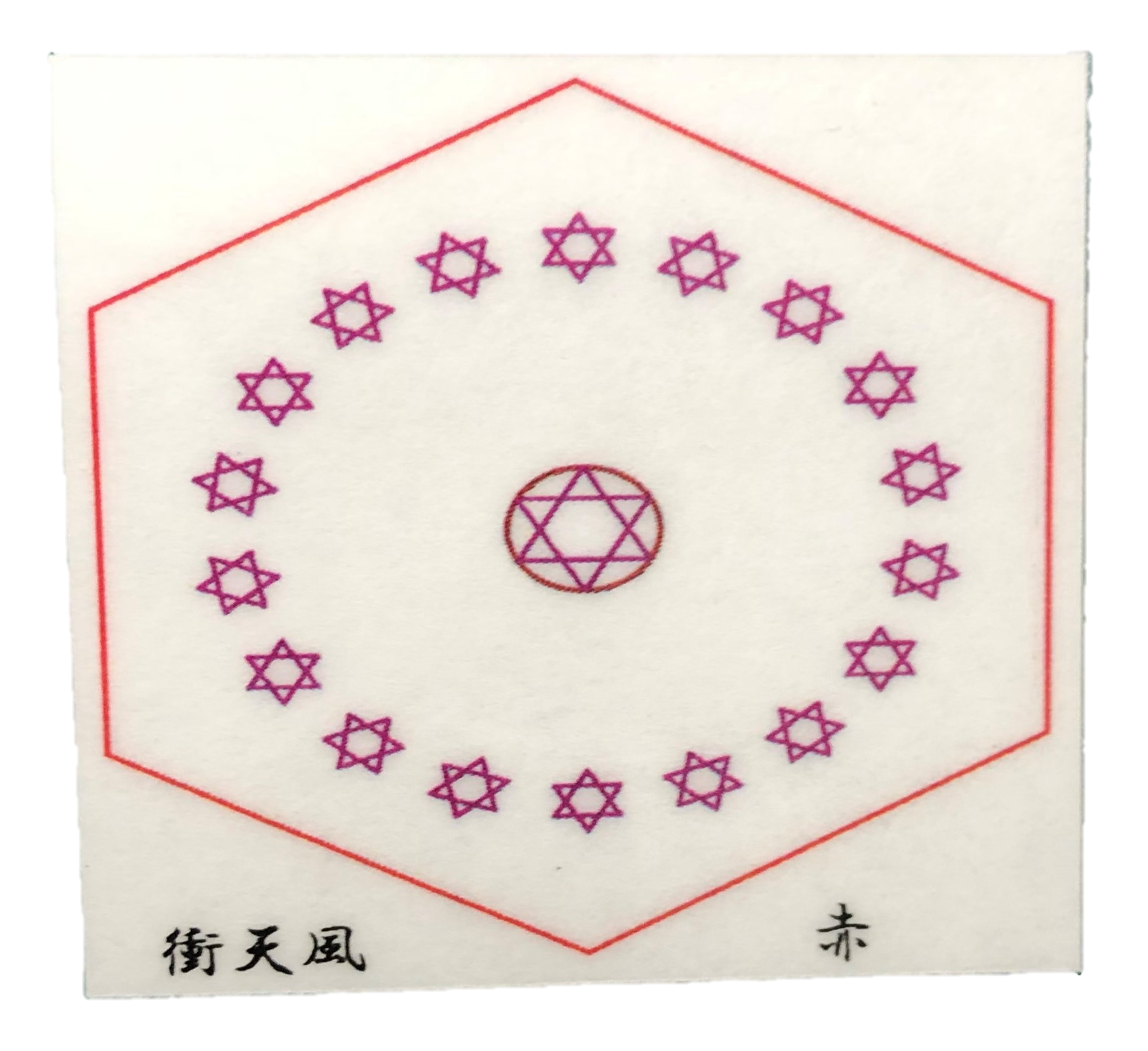 六芒星をイザナギイザナミ様の故事19男19女に因み図案化させていただき、神様の宿ると言われる六角形にて囲わせていただきました。