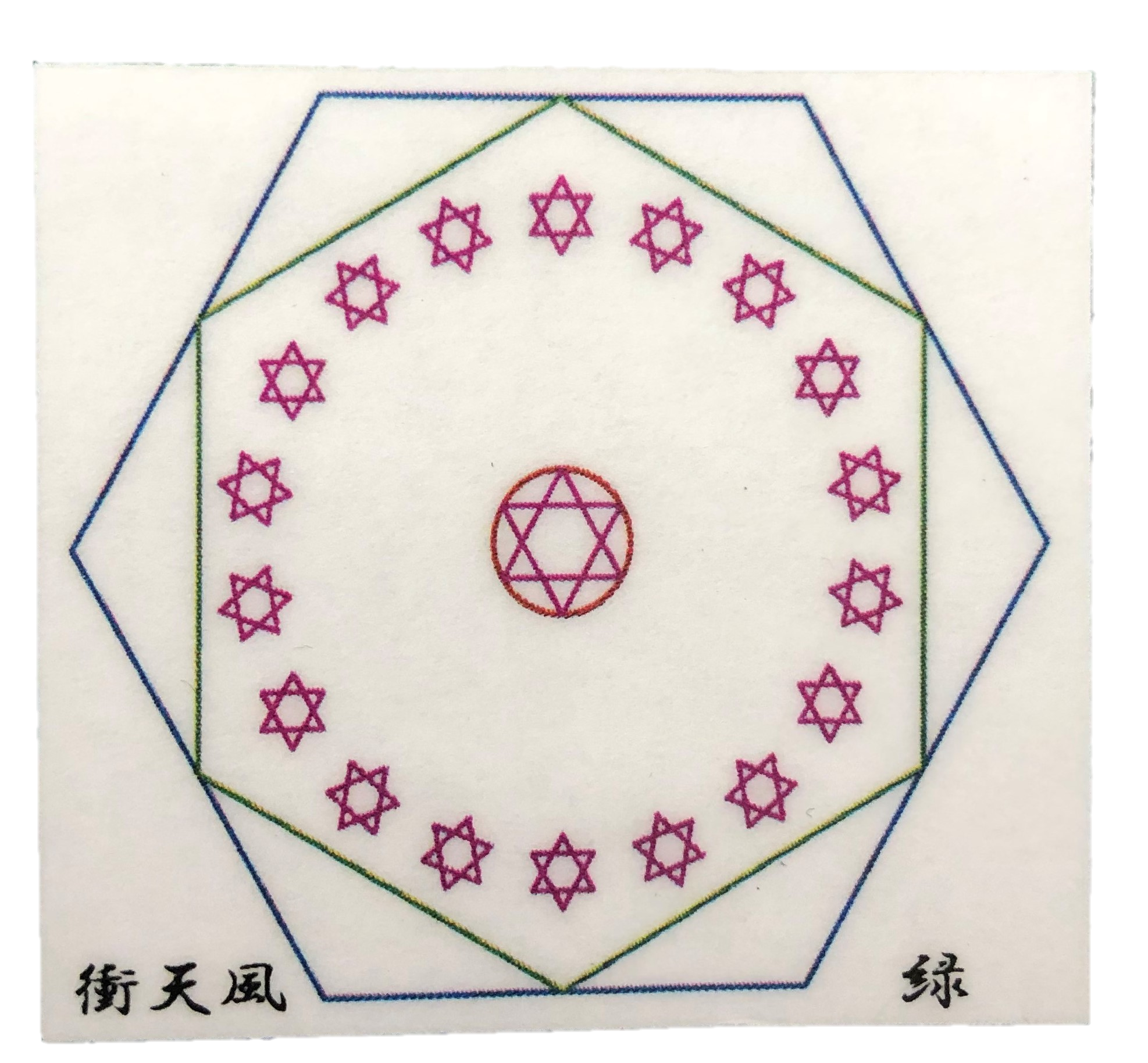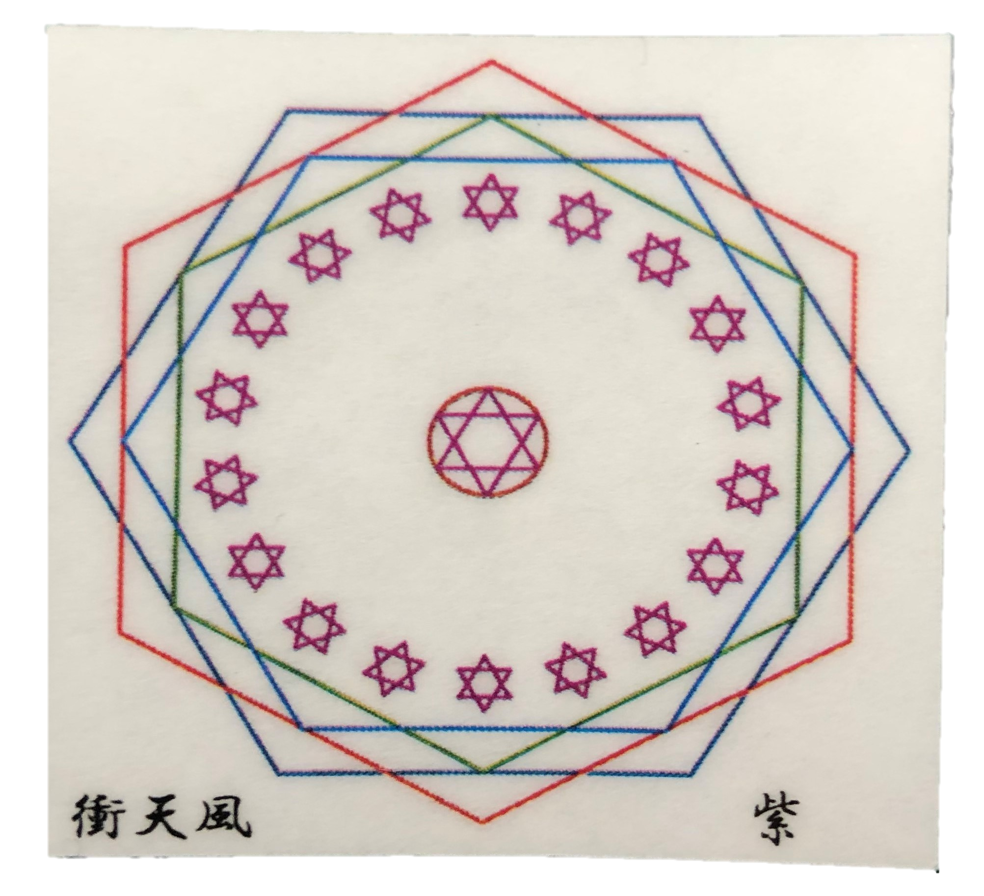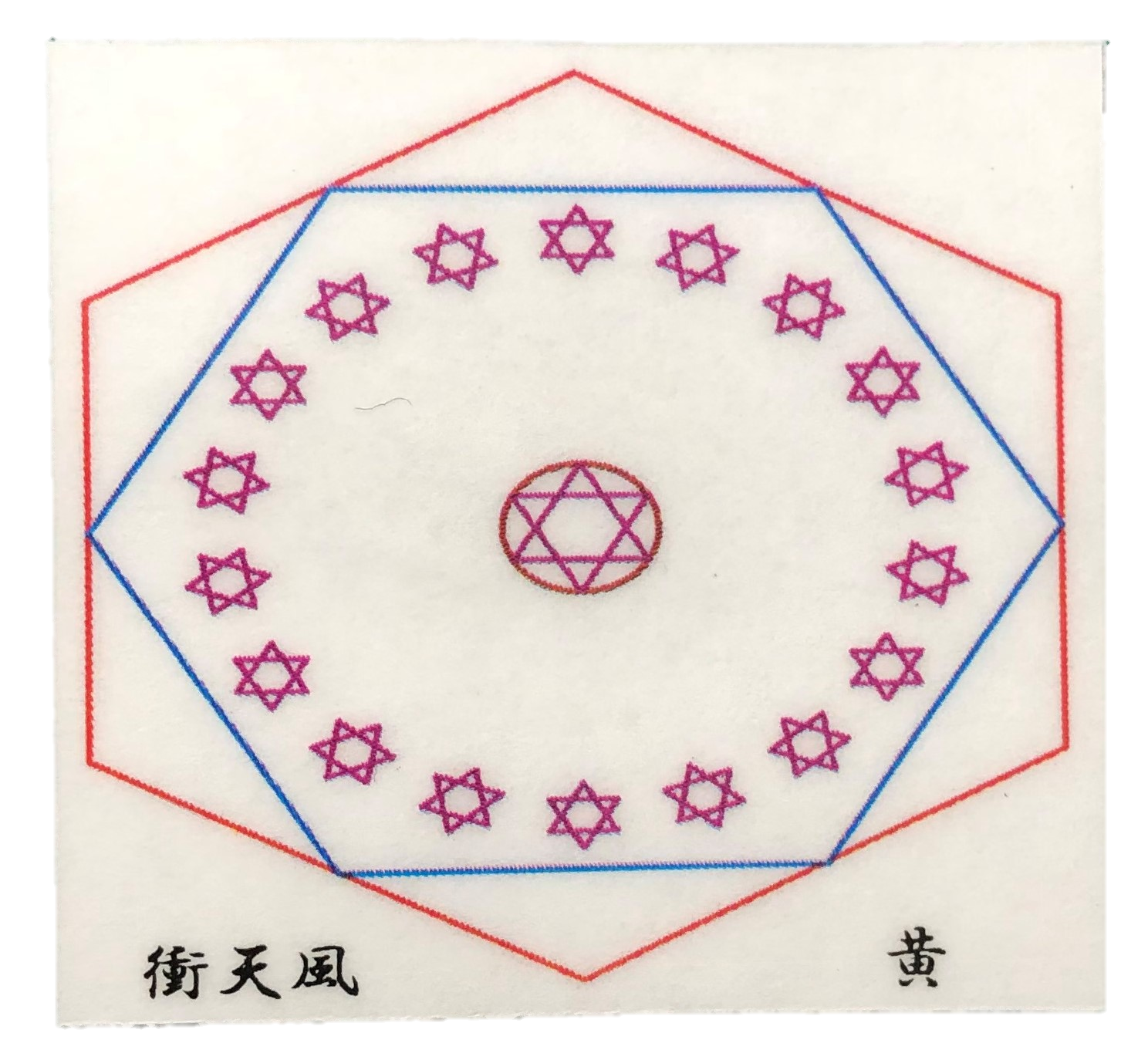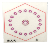 六芒星をイザナギイザナミ様の故事19男19女に因み図案化させていただき、神様の宿ると言われる六角形にて囲わせていただきました。